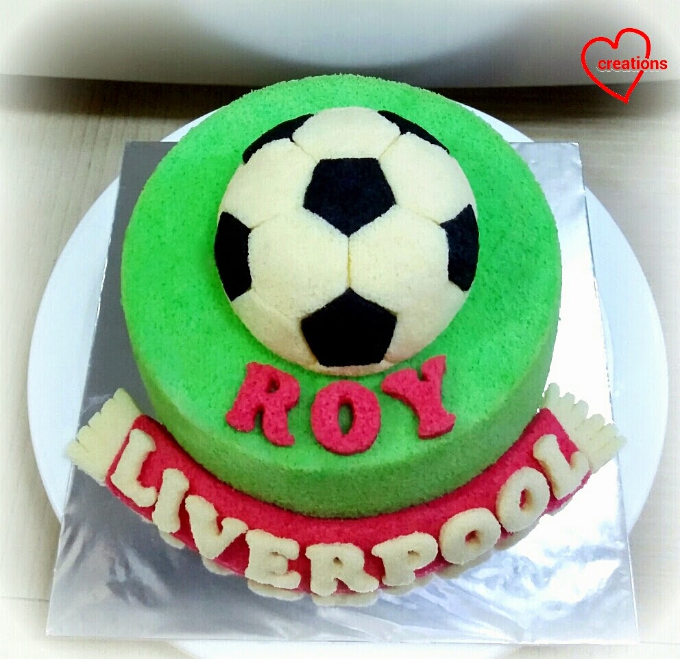 This is a Liverpool FC-themed chiffon cake for my friend's hubby who is a Liverpool fan! The colour theme is hence green and red like the club logo and decorated with a football on a green field with a Liverpool red scarf :).