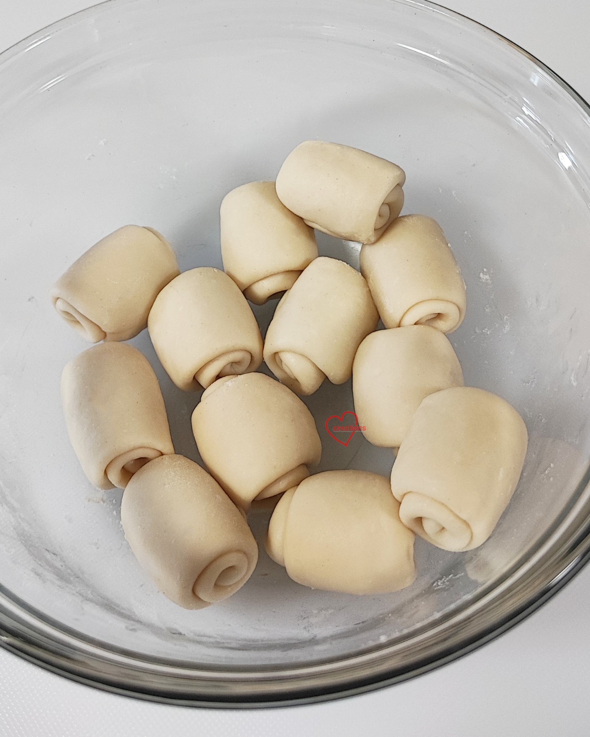 8. Wrap filling with dough. Press a swiss roll of dough with seam facing upwards flat. Fold the ends of the swiss roll inwards and press flat again. Roll the dough into a flat round disc with the edges thinner than the middle as shown in the reel. Place a ball of wintermelon filling in the middle and wrap it. Pinch the seams together and roll into a ball. Place on lined baking tray. Traditional wife biscuits are pressed into a flat disc on the baking tray but I left mine "roly-poly" shaped.